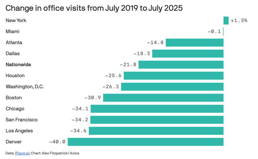 Office attendance just hit a turning point. In 2025, office visits in New York City increased 1.3% above 2019 levels, according to Placer.ai. That milestone makes NYC the first major US market to fully rebound. Finance-heavy industries helped drive the comeback, with mandates and culture playing a decisive role. But while NYC leads, other markets are still finding their footing.