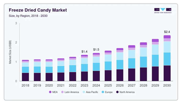 The global freeze-dried candy market was valued at $1.36 billion in 2023 and is projected to hit $2.38 billion by 2030, growing at a CAGR of 8.3%. Fruit-based products like strawberries, bananas, and tropical blends are the fastest-growing segment, with gummy bears emerging as the category’s breakout star.